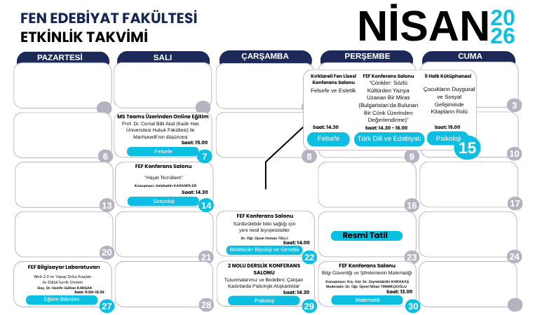 | FAKÜLTEMİZ NİSAN AYI ETKİNLİK TABLOSU 146 Okunma Fakültemizde Nisan ayında düzenlenecek yüz yüze ve çevrim içi etkinliklere ilişkin detaylı program... | ||