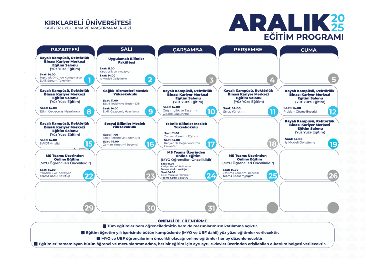 Kırklareli Üniversitesi Kariyer Uygulama ve Araştırma Merkezi tarafından hazırlanan Aralık 2025 Eğitim Programı, merkezimizin kullandığı kariyer yazılımı Yetenek Kapısı (www.yetenekkapisi.org) üzerinden yayımlanmıştır. Öğrenci ve mezunlarımız, Yetenek Kapısı portalına giriş yaparak program kapsamındaki eğitimlere başvuruda bulunabilir.