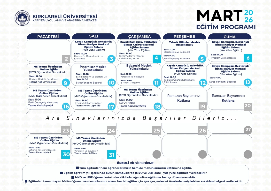 Kariyer Merkezi tarafından hazırlanan Mart 2026 eğitim programı yayınlanmıştır.