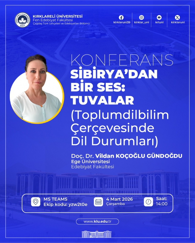 Ege Üniversitesi, Türk Dili ve Edebiyatı Bölümü öğretim üyesi Doç. Dr. Vildan KOÇOĞLU GÜNDOĞDU, Çağdaş Türk Lehçeleri ve Edebiyatları Bölümünün davetlisi olarak "Sibirya'dan Bir Ses: Tuvalar. (Toplumdilbilim Çerçevesinde Dil Durumları" başlıklı bir konferans verecektir. Öğretim üyelerimiz ve öğrencilerimiz etkinliğimize davetlidir.
