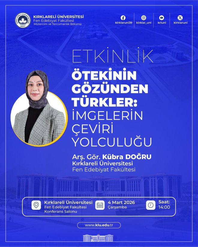 Arş. Gör. Kübra Doğru’nun konuşmacı olarak yer alacağı “Ötekinin Gözünden Türkler: İmgelerin Çeviri Yolculuğu” başlıklı etkinlik 04.03.2026, 14.00'da, Fakültemiz Konferans Salonunda gerçekleşecektir.