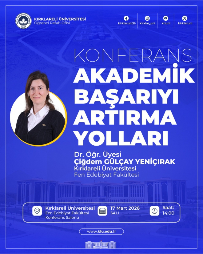 Üniversitemiz Öğrenci Refah Ofisi tarafından, “Akademik Başarıyı Artırma Yolları” konu başlıklı konferans düzenlenecektir.