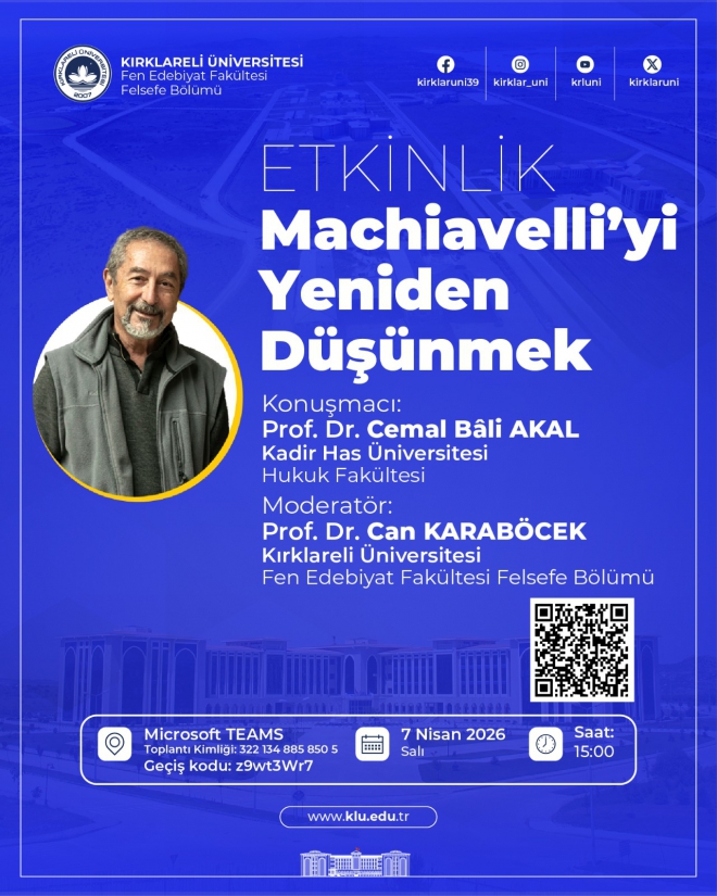 “Machiavelli’yi Yeniden Düşünmek” başlıklı etkinlikte, siyaset felsefesinin en etkili isimlerinden Machiavelli’nin fikirleri farklı yönleriyle ele alınacaktır. Etkinliğe, Kadir Has Üniversitesi Hukuk Fakültesi öğretim üyesi Prof. Dr. Cemal Bâli Akal konuşmacı olarak katılacaktır. Programın moderatörlüğünü ise Fakültemiz Felsefe Bölümü öğretim üyesi Prof. Dr. Can Karaböcek üstlenecektir.