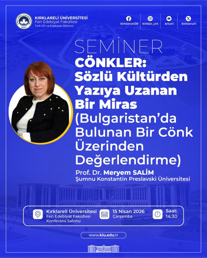 Şumnu Konstantin Preslavski Üniversitesi öğretim üyesi Prof. Dr. Meryem Salim’in konuşmacı olarak katılacağı seminerde, Bulgaristan’da bulunan bir cönk üzerinden sözlü geleneğin yazıya aktarım süreçleri, kültürel süreklilik ve edebi miras bağlamında değerlendirilecektir.