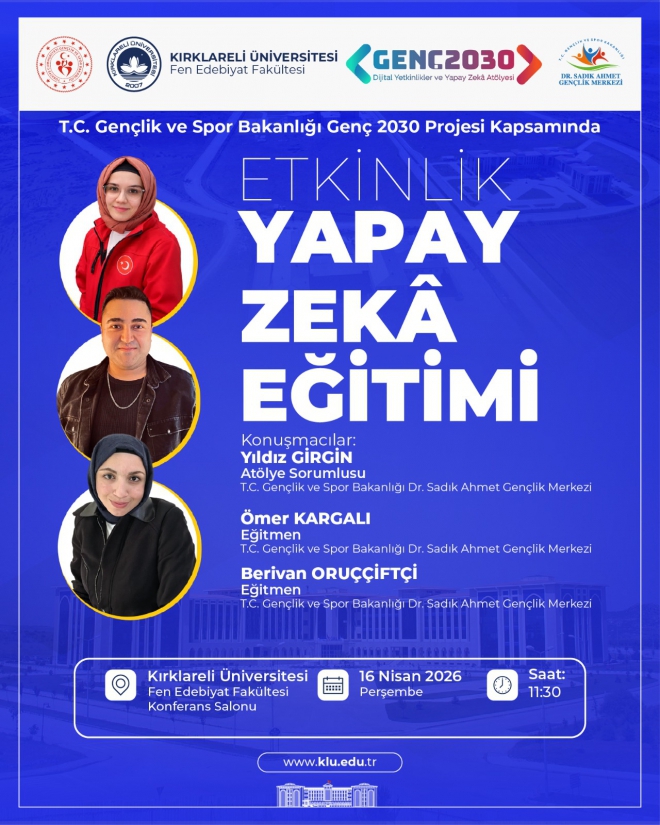 Fakültemiz tarafından, T.C. Gençlik ve Spor Bakanlığı Genç 2030 Projesi kapsamında “Yapay Zekâ Eğitimi” etkinliği düzenlenecektir.