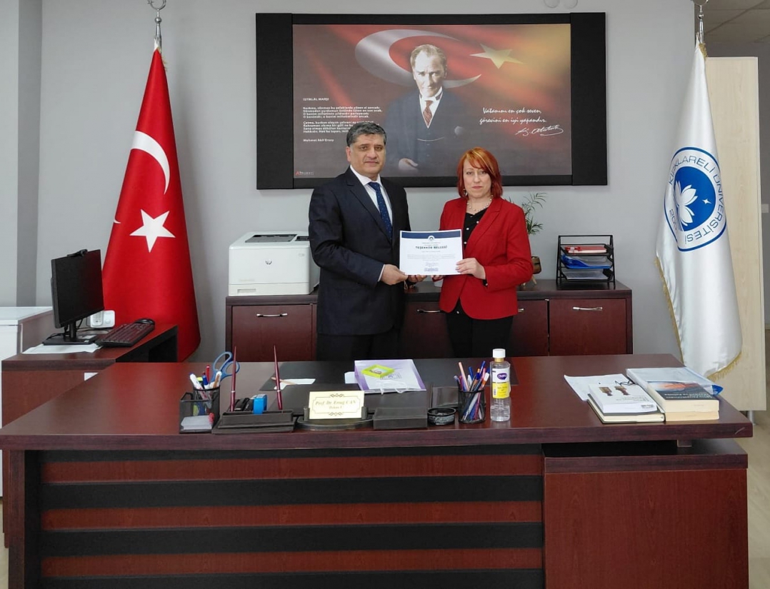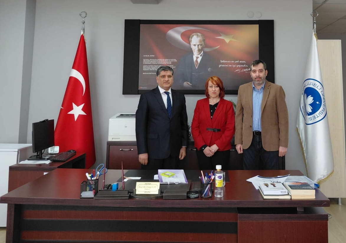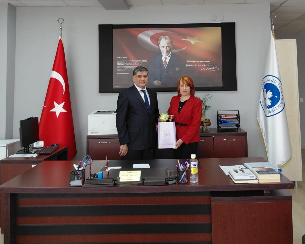 “Cönkler: Sözlü Kültürden Yazıya Uzanan Bir Miras (Bulgaristan’da Bulunan Bir Cönk Üzerinden Değerlendirme)” başlıklı seminer kapsamında Türk Dili ve Edebiyatı Bölümüne misafir olan Şumnu Konstantin Preslavski Üniversitesi öğretim üyesi Prof. Dr. Meryem SALİM dekanımız Prof. Dr. Ertuğ CAN’ı ziyaret etti. Türk Dili ve Edebiyatı Bölüm Başkanı Doç. Dr. Beytullah BEKAR’ın da eşlik ettiği ziyarette karşılıklı fikir alışverişinde bulunuldu. Dekanımız nazik ziyaretleri ve hediyeleri için kendilerine teşekkür etti.